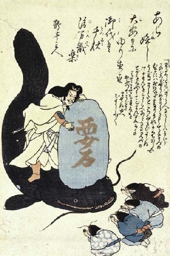 「この国には、大なまずがいて、頭を鹿島大明神が抑え、尻尾を鹿(奈良)、狐(京都)、鼠(大阪)が抑えている。しかし、鹿島大明神が留守をすると、大なまずが暴れ地震が起こる。」という