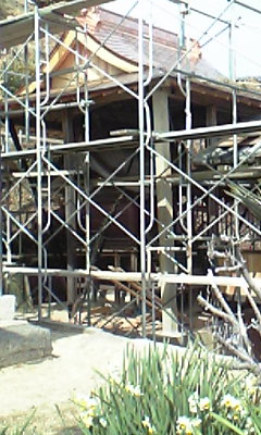 現在は本殿、拝殿共修復中!